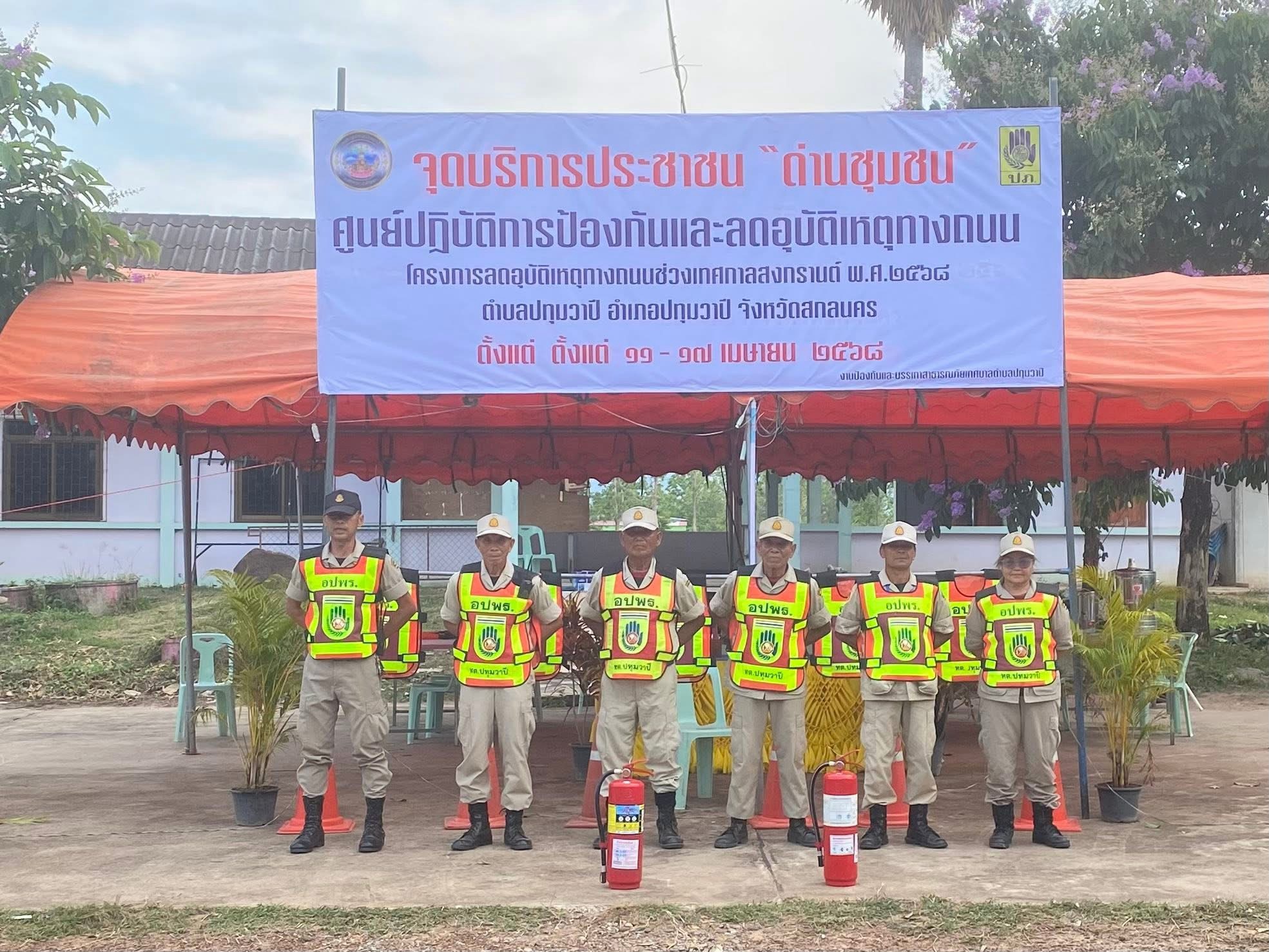 วันที่ 11 เมษายน 2568 เทศบาลตำบลปทุมวาปี ได้ดำเนินโครงการลดอุบัติเหตุบนท้องถนนและการตั้งจุดบริการประชาชนช่วงเทศกาลสงกรานต์ ประจำปีงบประมาณ 2568 ระหว่างวันที่ 11 – 17 เมษายน 2568 โดยดำเนินการจัดตั้งจุดบริการประชาชน เพื่อเป็นการลดอุบัติเหตุบนท้องถนน ลดอัตราการสูญเสียชีวิต และทรัพย์สินของประชาชน ตามนโยบายของรัฐบาล ณ บริเวณศาลาประชาคมบ้านบ่อแกใหญ่ หมู่ที่ 5 ตำบลปทุมวาปี อำเภอส่องดาว จังหวัดสกลนคร